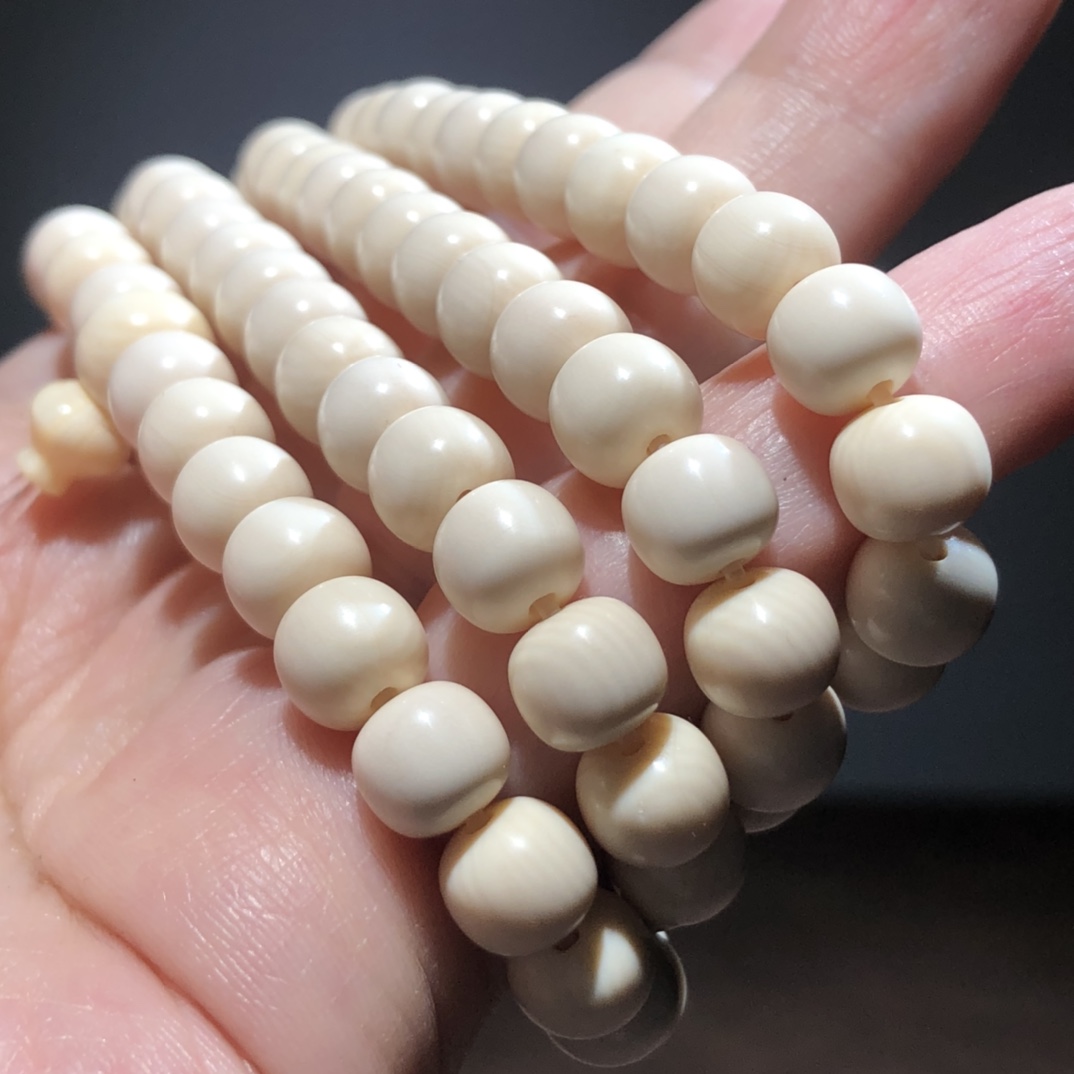 《108桶珠佛珠》猛犸牙顶级冰料,天然原色无优化!牙质细腻满纹,粒粒饱满油润,相当漂亮!越盘越美!
